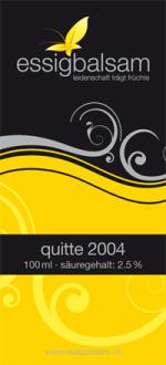 | QuittenbalsamQuitte â nicht Apfel, nicht Birne und in rohem Zustand nicht geniessbar â als Essig jedoch eine besondere Spezialität. Verwendet wird dieser zum Verfeinern von Saucen und Marinaden und ist vor allem ein hervorragender Begleiter von Käse. Der Artikel ist ab Lager verfügbar. |